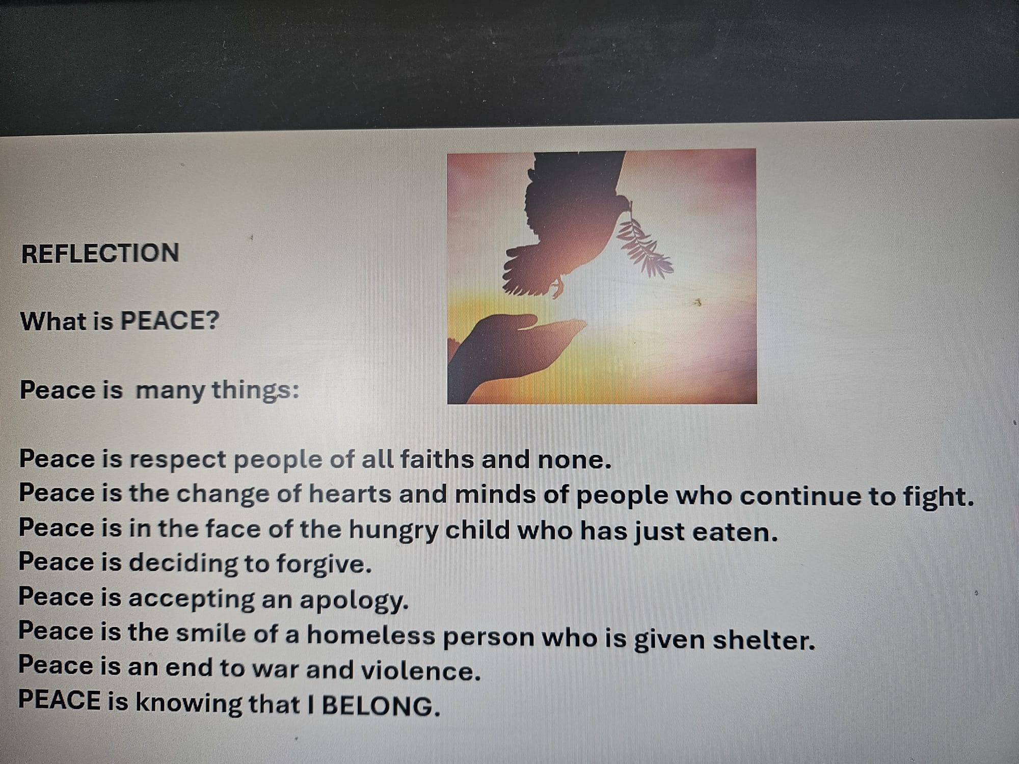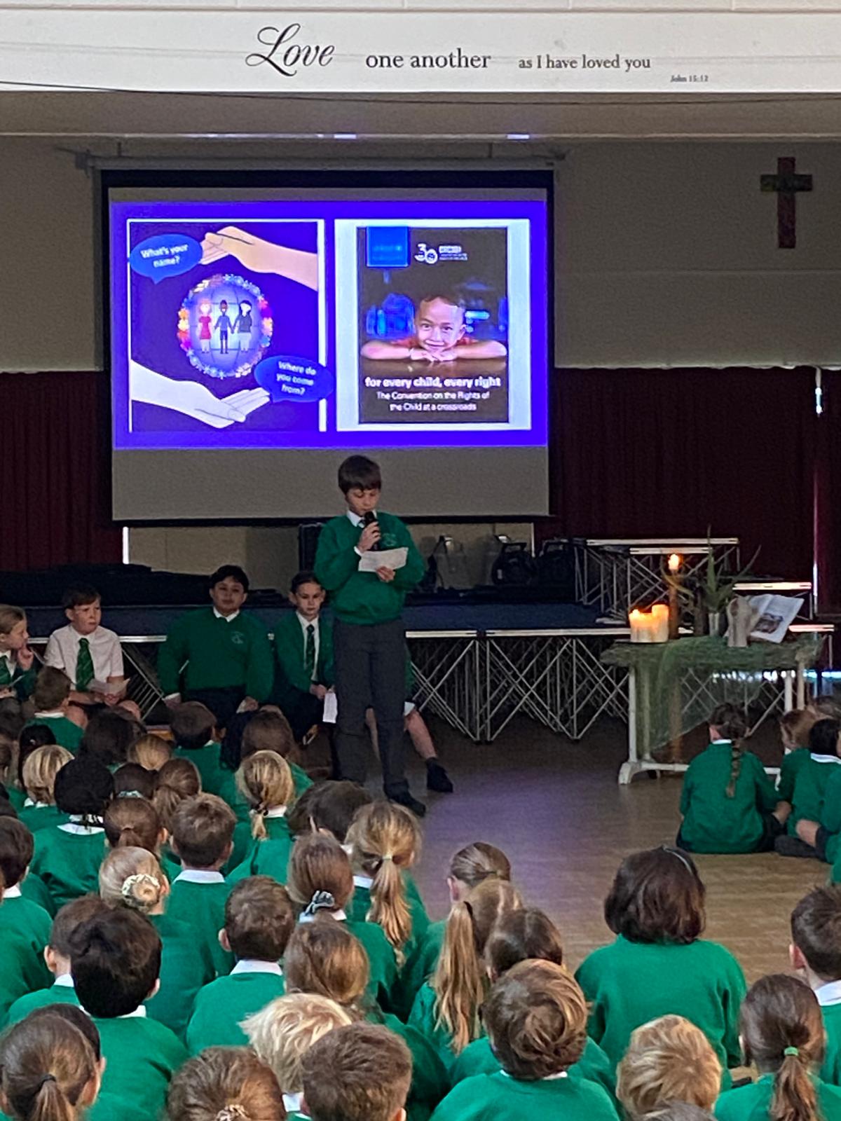 Each term the whole school follows a carefully planned programme for Worship. As a Church of England school, our Worship follows the Christian calendar and Bible teachings but also includes themes which address both national and global issues. On a Monday the theme is introduced by the head teacher or deputy head. Pupils will also regularly lead the whole school worship. This is then explored further over the week both in key stage and class worship sessions. Worship is conducted as a whole school three times a week and in class or with the local vicar twice a week. The following images give an idea of the kinds of themes covered during school worship. Worship is inclusive so that every member of the school community feels comfortable to participate and develop their spirituality in their own way.